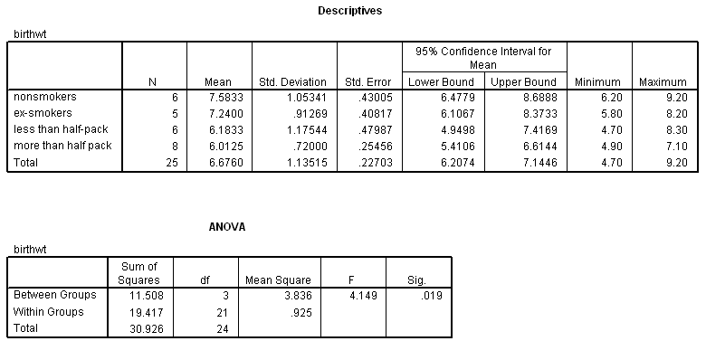 13.6 Smoking and birth weight. This data set (smoking-moms.sav) was introduced in the prior chapter. Descriptive statistics and the ANOVA table for the problem are reported below. Conduct post hoc comparisons of all the groups with the LSD method. (There are 6 possible post-hoc comparisons.) State the null hypothesis in each instance, report the t statistics, their df, and P value. Interpret each test.
