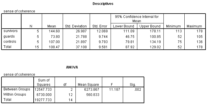 13.5 Sense of coherence. Summary statistics and an  ANOVA table for the "sense of coherence" data (soc.sav) introduced in the prior chapter are shown below. Conduct post-hoc comparisons using a Bonferroni adjustment. Summarize the results.