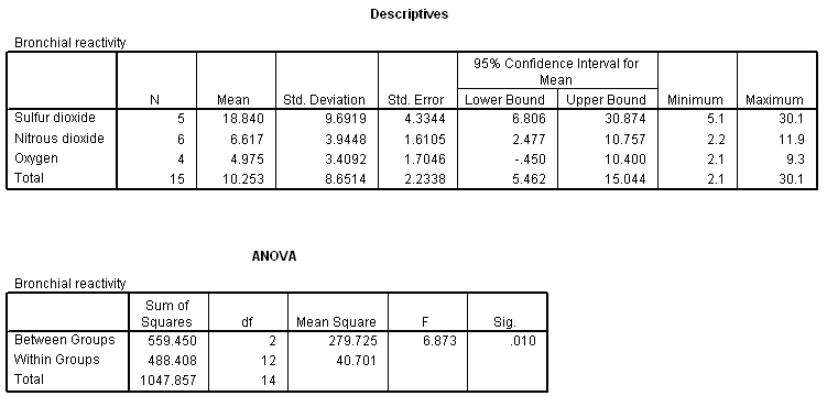 13.4 Bronchial reactivity. An exercise in the prior chapter looked at bronchial reactivity in asthmatics following exposure to noxious gases. The analysis revealed significant differences in airway reactivity. Summary statistics and the ANOVA results are shown below. Now conduct post hoc comparisons using the LSD method (bronch-react.sav). In each instance, state the null hypothesis, test statistic, df, and P value. Interpret each test.