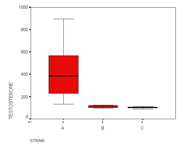 13.21 Testosterone levels in roosters (visual inspection of boxplots). A zoologist wanted to determine if testosterone in three strains of mature roosters differed (Hampton, 1994, p. 147). Data are: