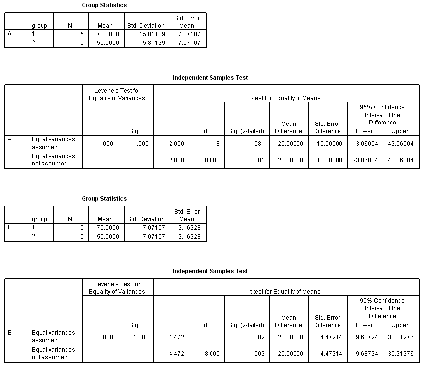 11.1  Comparing means depends on within group variability. ...we are confident the difference observed in Comparison B is real, while the observed difference in Comparison A might be due to chance fluctuation. Conduct t tests (for both comparisons) to confirm this suspicion. Calculations are shown below. Notice that even though Comparison A and Comparison B both compare a mean of 70 to a mean of 50, Comparison A derives P = 0.081, while Comparison B derives P = 0.002. Return to the stemplots in the exercise to see how this relates to the variability within groups.
